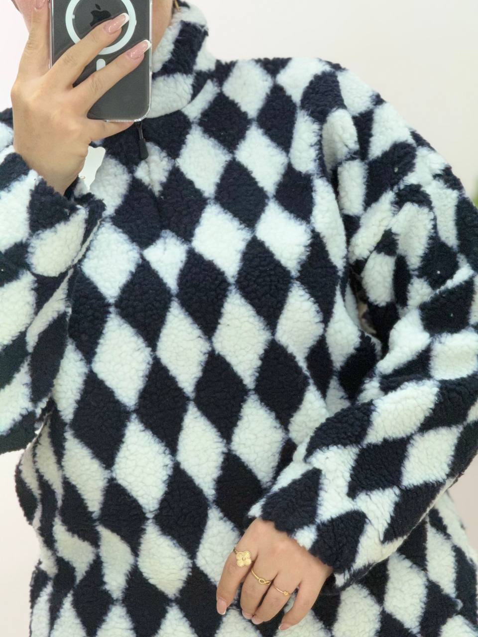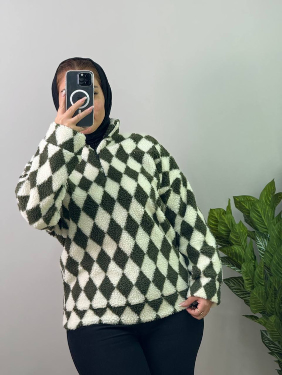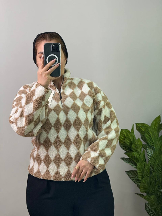بلوز یقه نیم زیپ تدی شطرنجی اسپرت پشمی